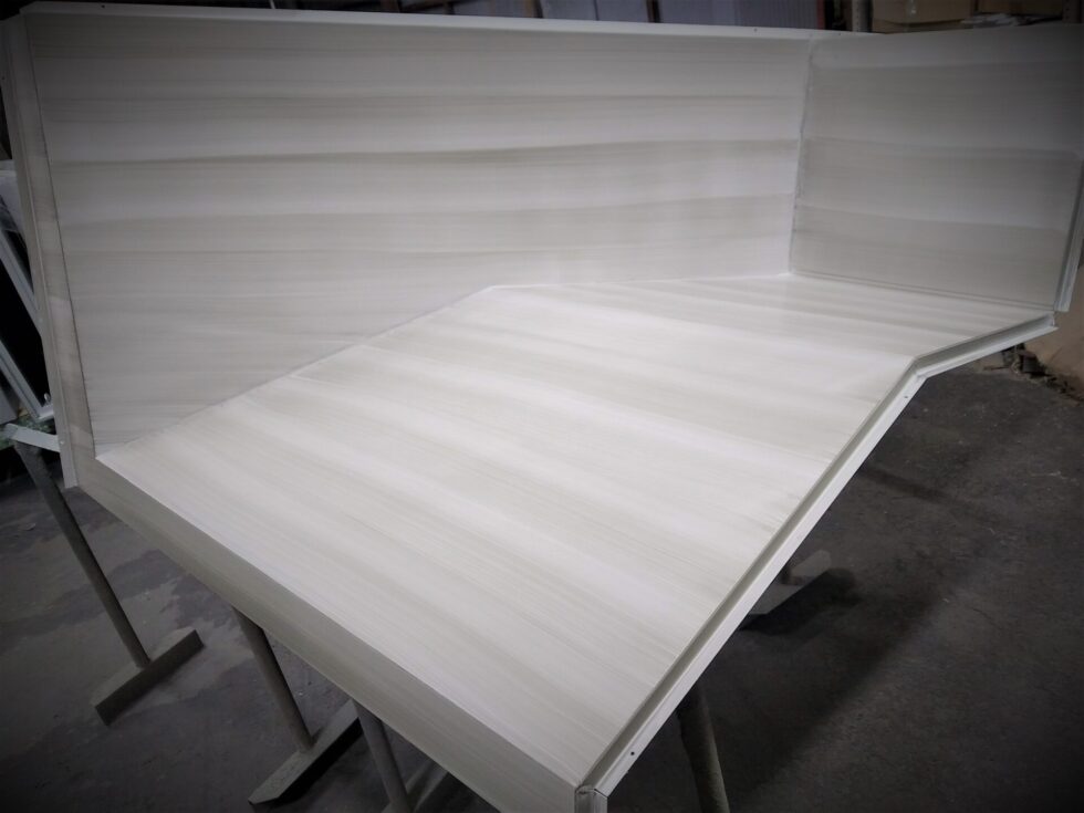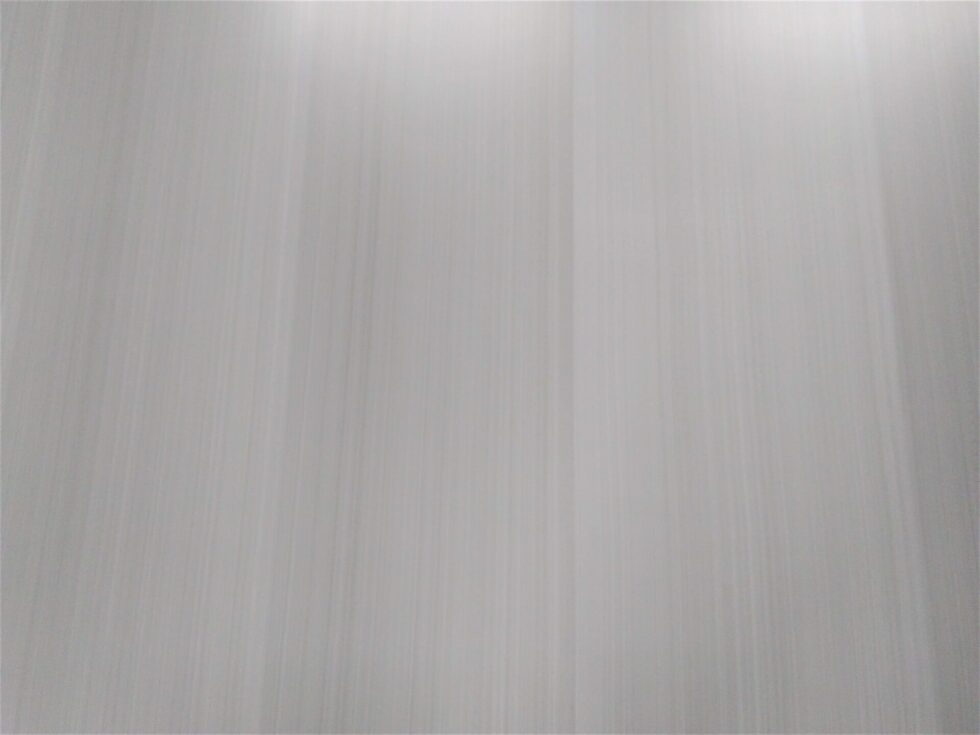 白い木目調は、技術的にとても大変なのです。ベース色の白の上に、黒の木目を描くのですが、少しでも模様が濃く(黒く)なると、模様の黒さが勝ってしまい、全体的にグレー色になってしまうのです。かといって、薄すぎると、木目模様が見えない、となってしまいます。この、見えるようで見えない、微妙な木目の濃さを出すのが、とても難しいのです。