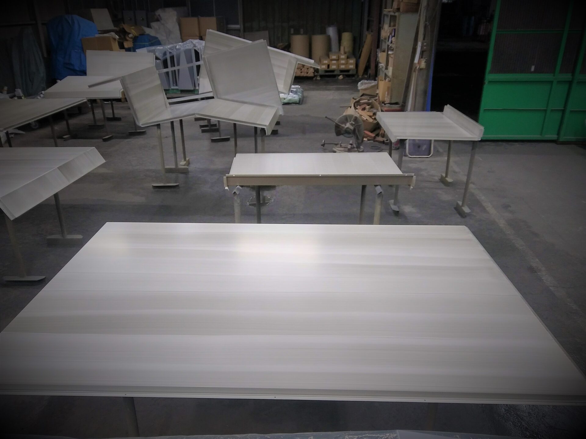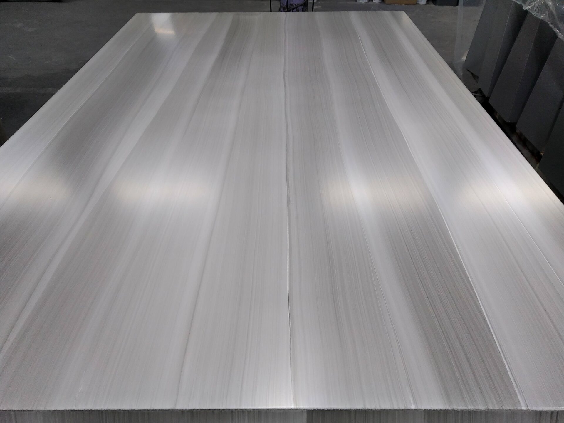 白い木目調は、技術的にとても大変なのです。ベース色の白の上に、黒の木目を描くのですが、少しでも模様が濃く(黒く)なると、模様の黒さが勝ってしまい、全体的にグレー色になってしまうのです。かといって、薄すぎると、木目模様が見えない、となってしまいます。この、見えるようで見えない、微妙な木目の濃さを出すのが、とても難しいのです。