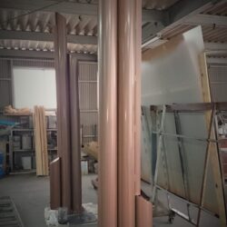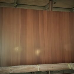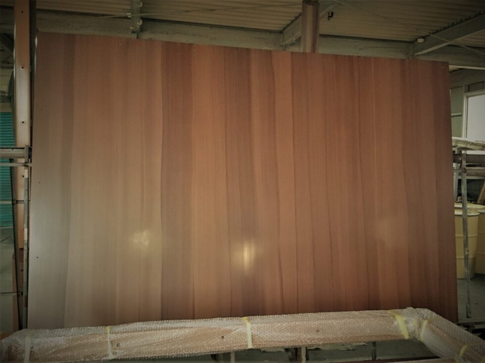 当社にはSFコーティングという、木目調塗装の方法がありますが、塗装できる寸法や形状に制限があります。当然、今回のような巨大なサインには対応できません。