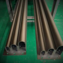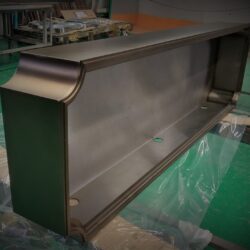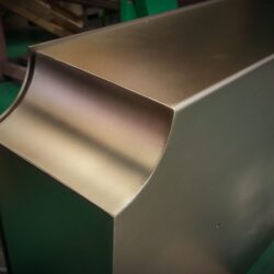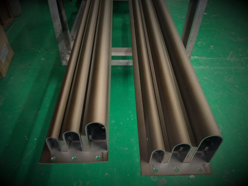 ステンレスを真鍮古美色にする場合は、まずは黄色のカラークリアーを塗装して真鍮色にします。その後、黒のカラークリアーを塗装して、真ちゅうが燻された雰囲気を出しています。