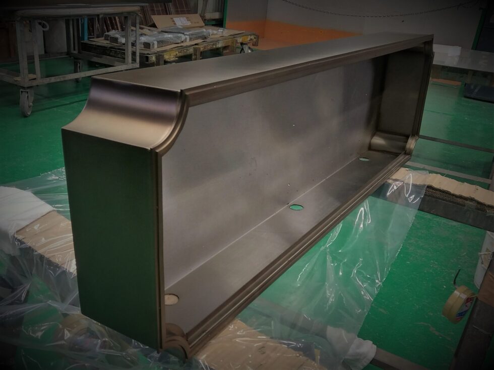 2色のカラークリアーの塗り重ねなので、高いレベルの技術が必要になります。特に、箱型の製品は、角の部分が塗装が塗り重なって色が濃くなりがちなので、上手に調整しながら塗っていきます。