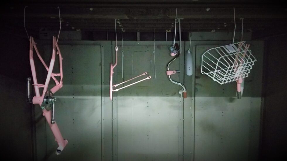 自転車を解体できるところまで解体。キズはパテ処理で補修。メッキのまま残す部分はマスキング。他の部分や丁寧に研磨して下地づくり。サテン模様をリセットするために、プライマーサフェーサー塗装。上塗りはウレタン塗装。乾燥炉で60℃で乾燥。復旧組み立てをして完成。社内に自転車マニアがいてたすかりました。
